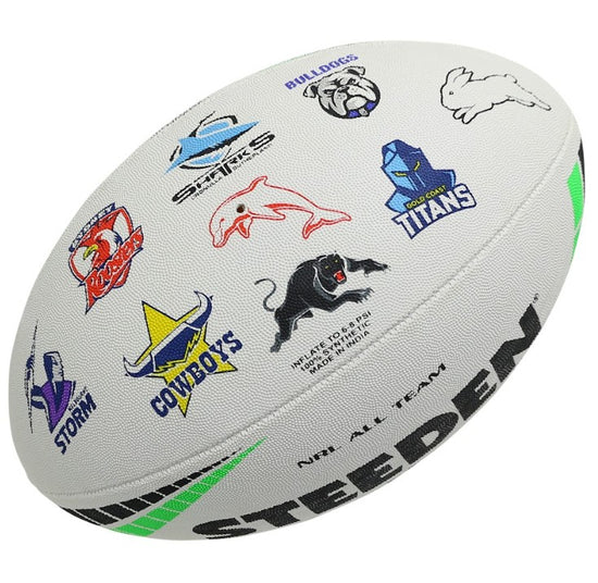 This Steeden NRL all team logo rugby ball Size 3 is perfect for any young NRL fan! This NRL all team rugby ball is a 2 ply construction, with the panels been cut using advanced symmetrical laser cutting technology. This ball is hand stitched and has a super latex bladder for better air retension. This NRL all team logo rugby ball is a great way to celebrate this special holiday, and serves as a fantastic gift to your favorite rugger!